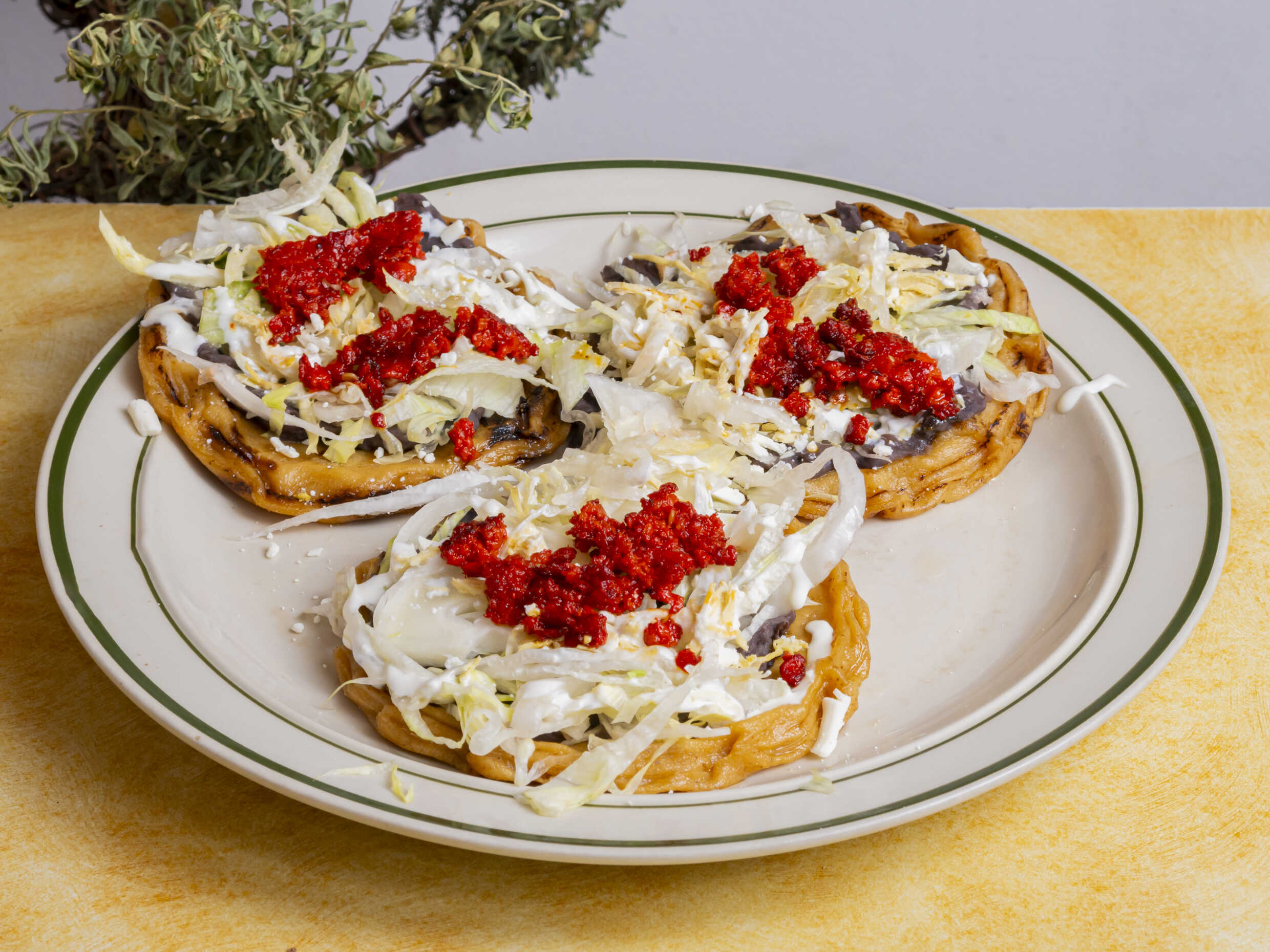 2 piezas de sopes con Chorizo, queso, crema, lechuga y salsa.