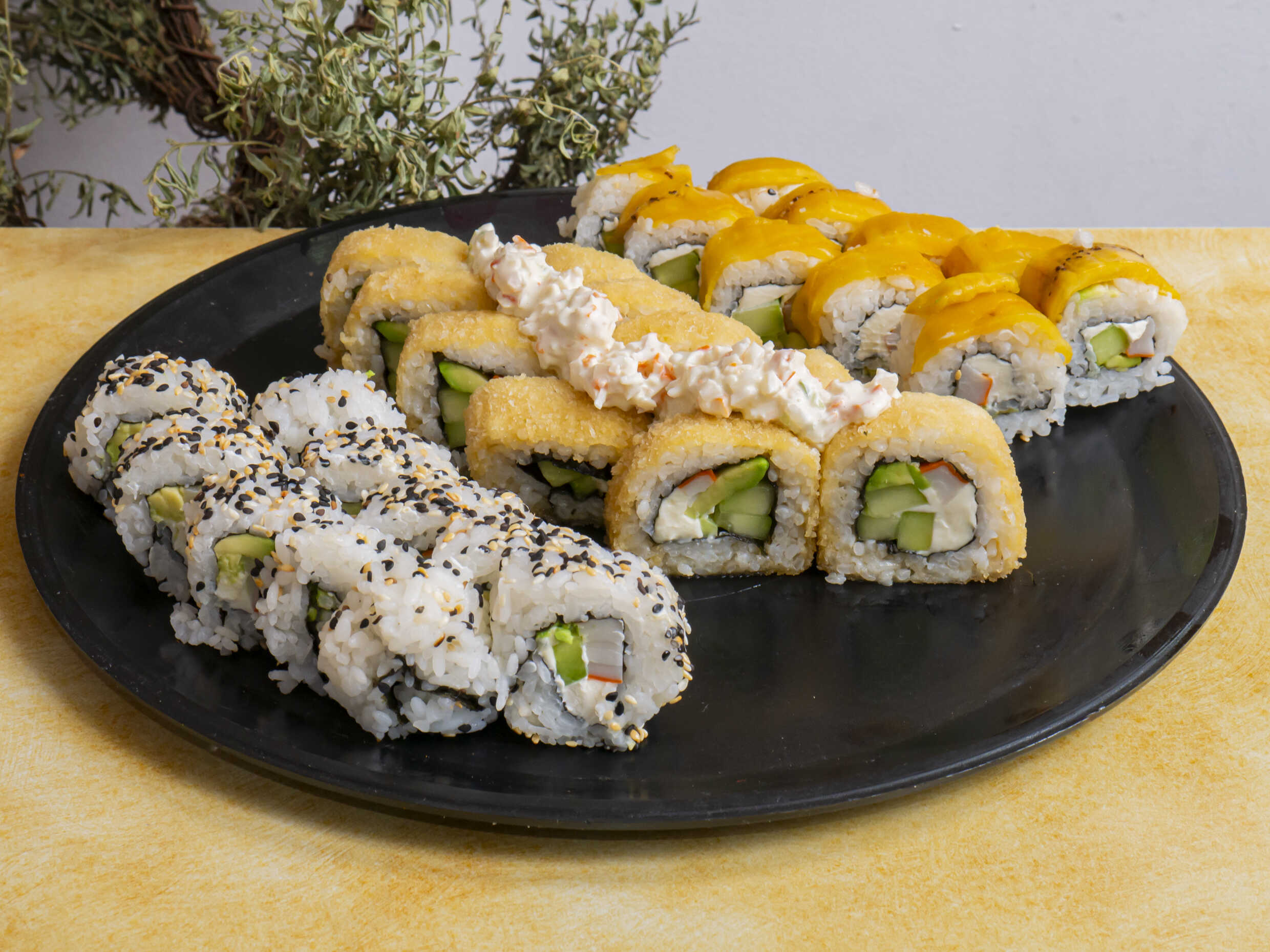 P.F. Ajonjolí. P.D. Pepino +queso crema +aguacate +camarón.
