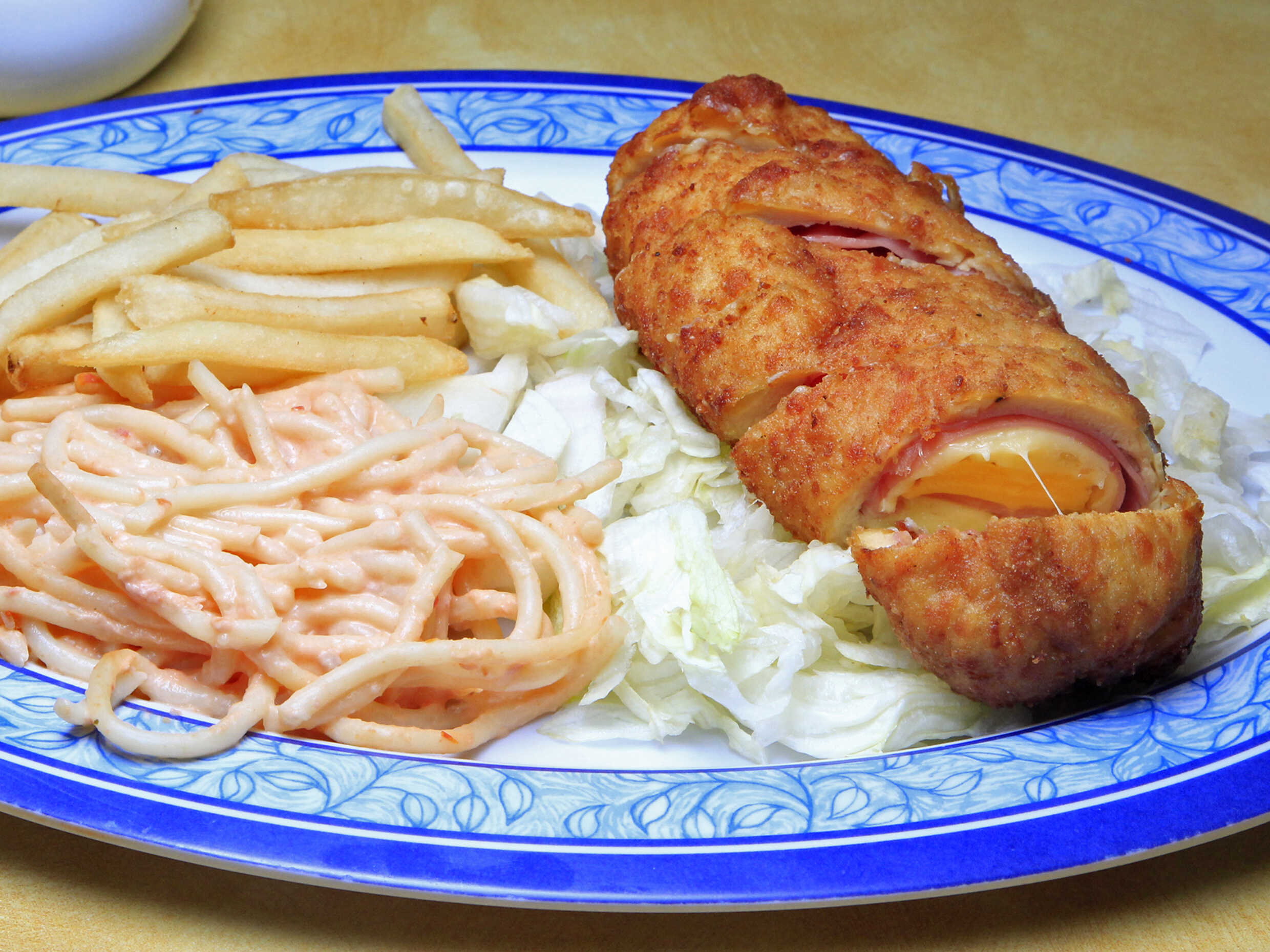 Pechuga empanizada (100 g apróx.), rellena de jamón con queso Oaxaca o manchego, acompañada de espagueti y papas a la francesa (100 g Apróx.). Salsa especial del día (va por aparte). (Platillo personal)