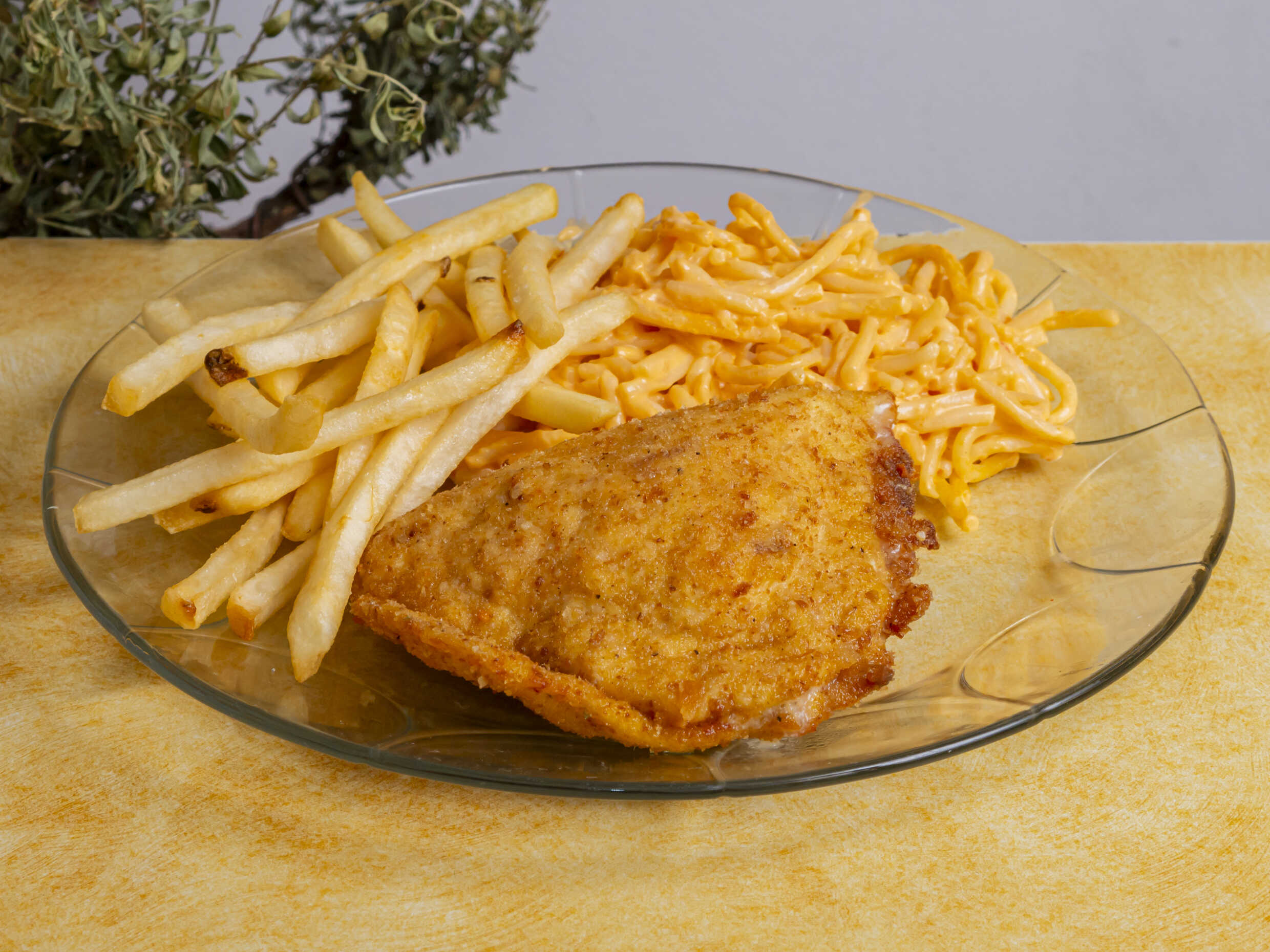 Pechuga empanizada 100 gramos aprox, acompañada de papas a la francesa 80 gramos y sopa de espagueti ( 120 gramos)