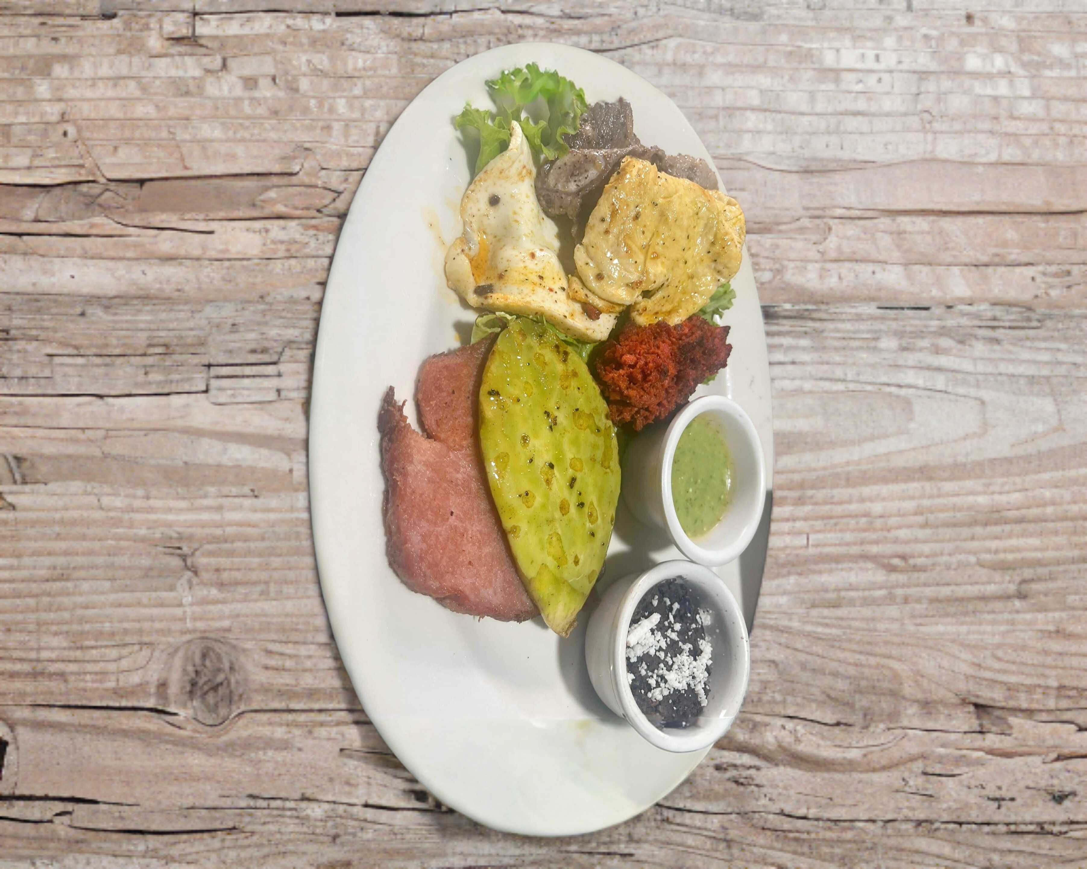 350 g De combinación de carne, costilla, pechuga, chorizo, chuleta, pollo y queso con nopal asado, guacamole, arroz y agua de cortesía.