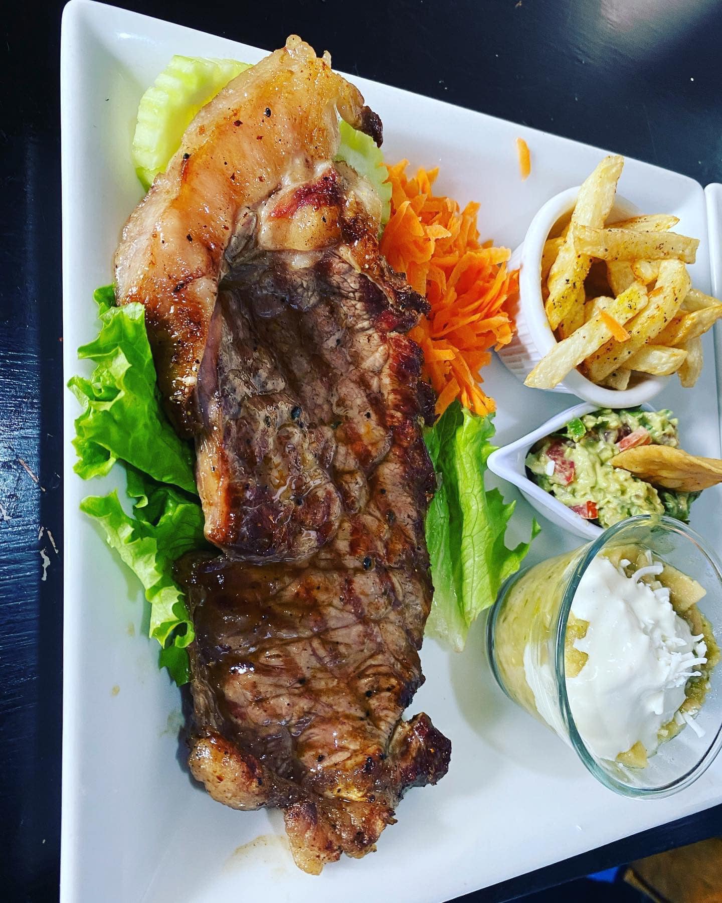 250 g De suave carne, acompañada de papas fritas a la francesa y ensalada de cortesía arroz y agua.
