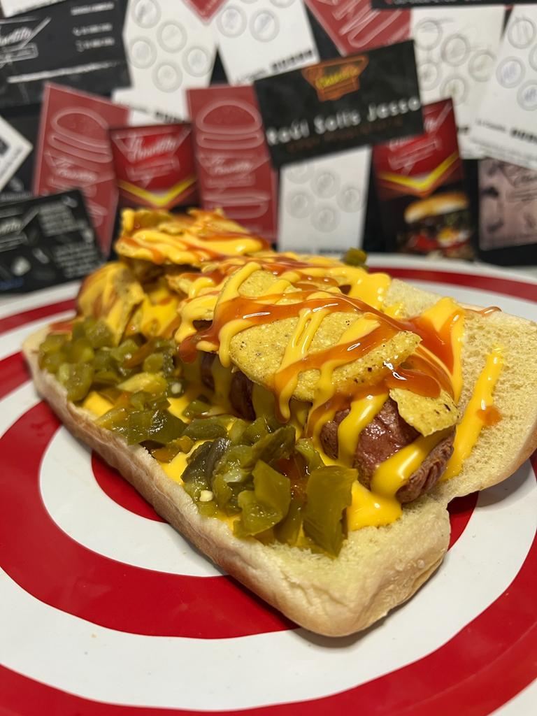 Pan extra grande, salchicha jumbo, nachos, queso líquido, cátsup, chile.