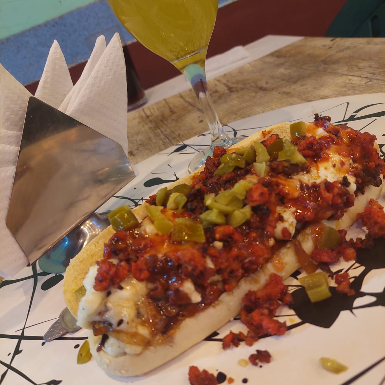 Pan extra grande, salchicha jumbo, chilli bean (carne molida, frijol refrito, chorizo, tocino, adobo de 3 chiles), queso líquido, cátsup, chile.