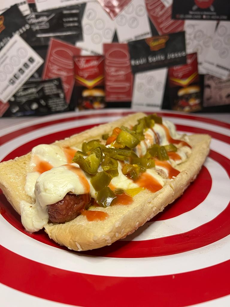 Pan extra grande, salchicha jumbo, salsa BBQ, queso Oaxaca, chorizo, cátsup, chile, mayonesa, mostaza.
