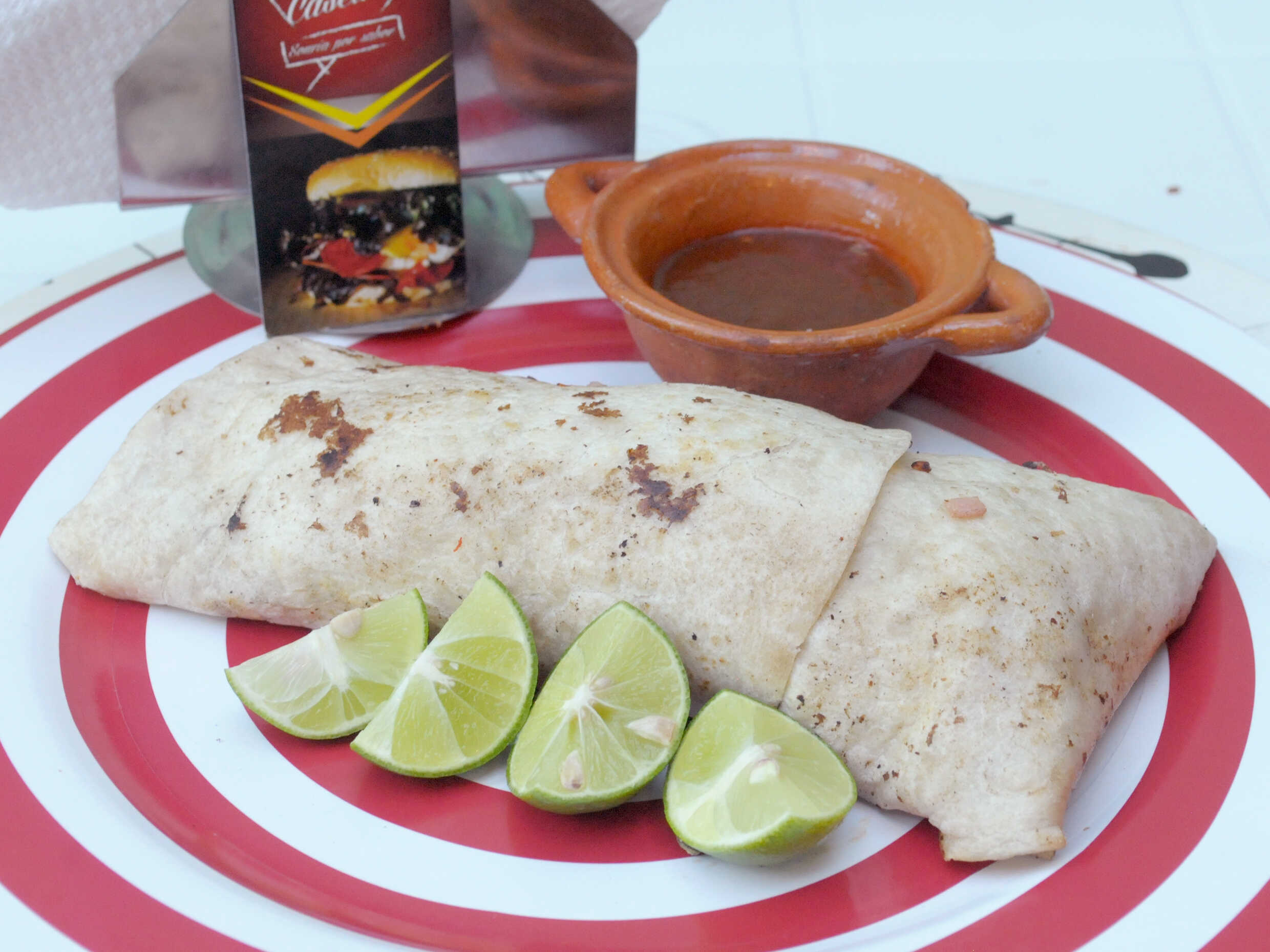 Tortilla de harina, frijol refrito, queso Oaxaca, salsa de chipotle aparte y chorizo.
