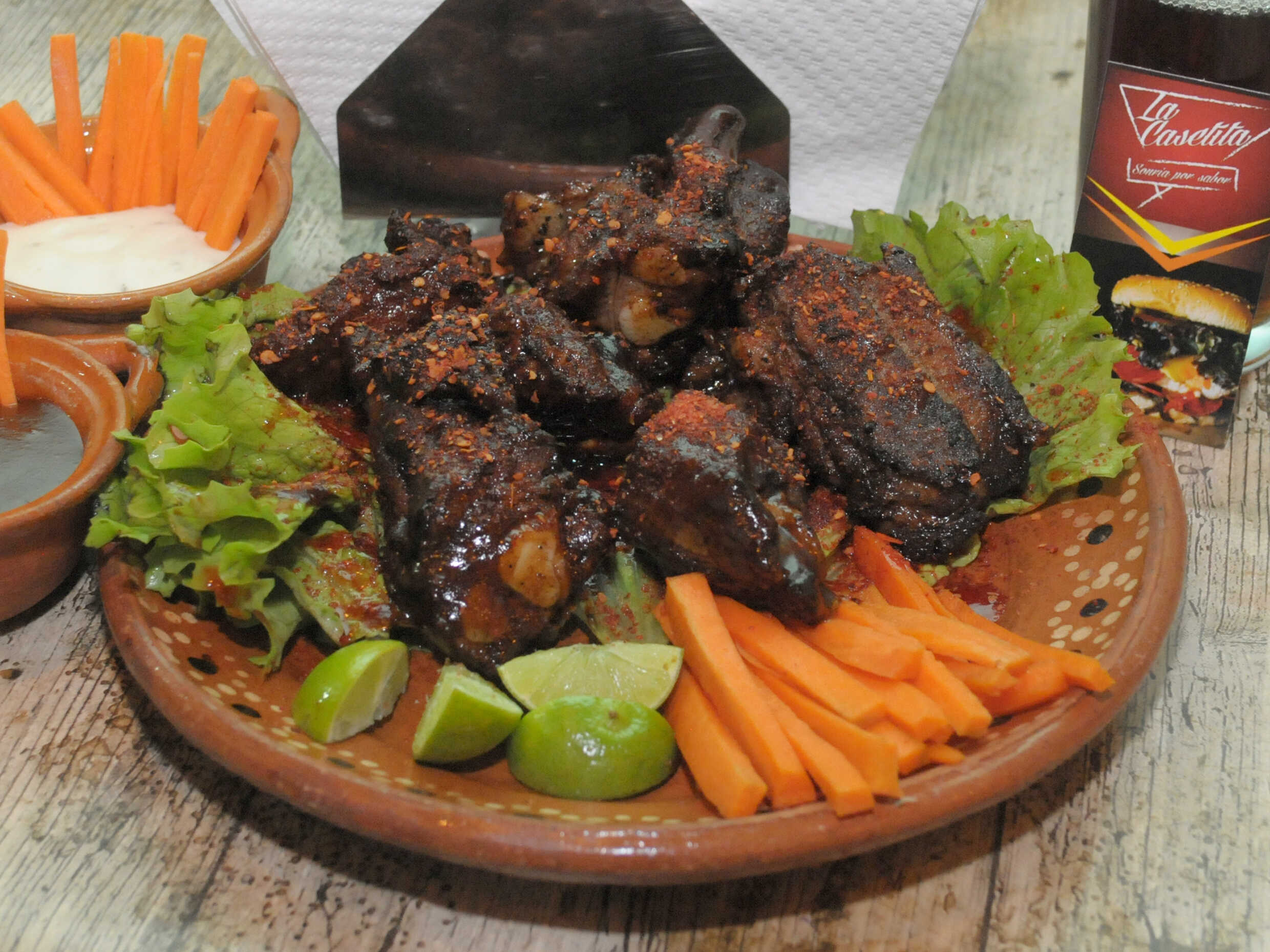 5 Piezas de costillas de cerdo fritas, naturales o bañadas en salsa BBQ, acompañados de bastones de zanahoria y una cama de lechuga.