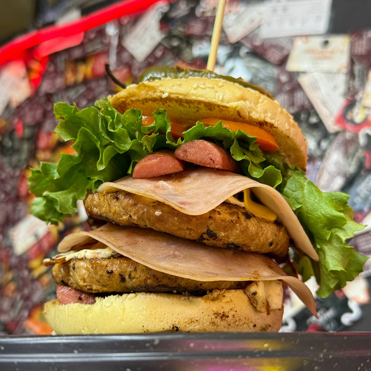 Pan, doble porción de carne, queso oaxaca, queso amarillo, tocino, vegetales y aderezos.