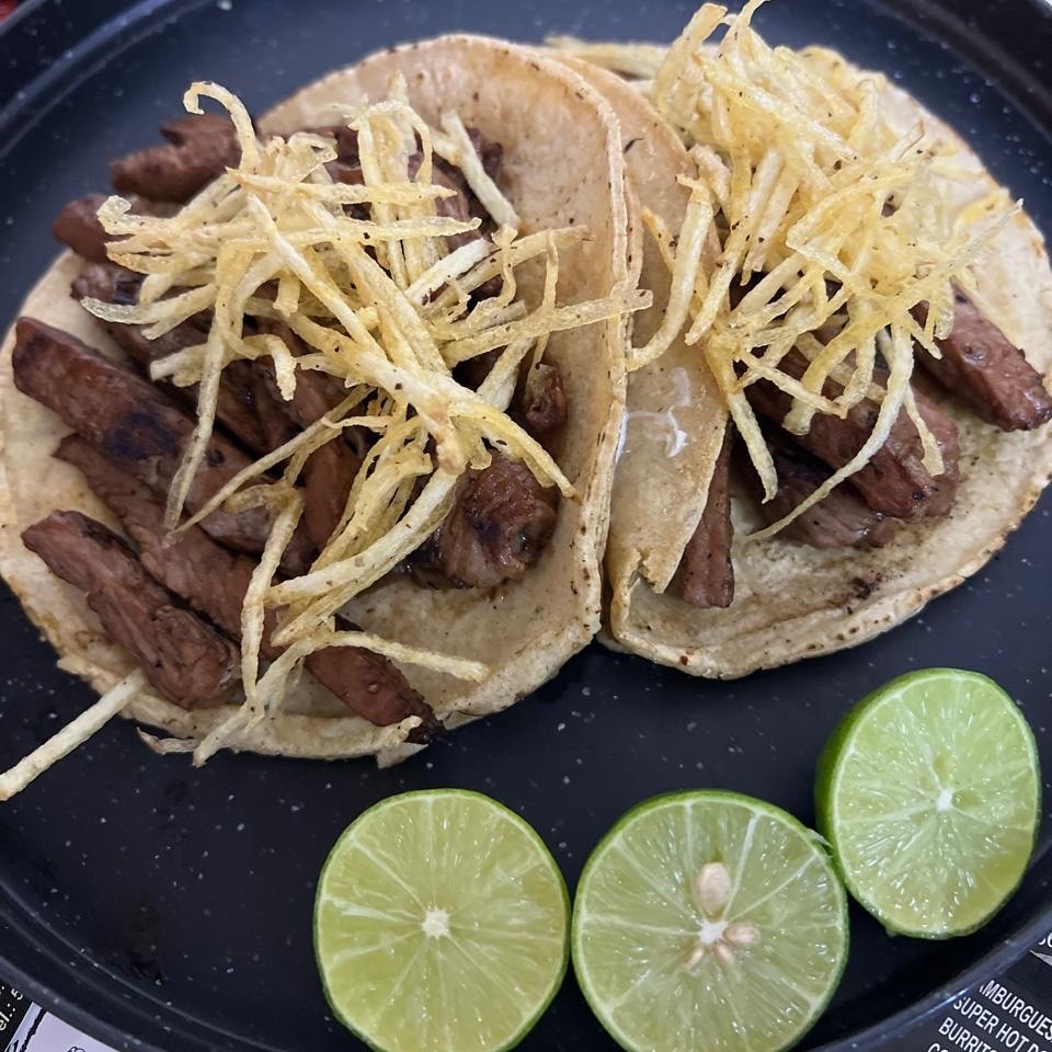DOBLE TORTILLA, QUESO OAXACA, CEBOLLA CARAMELIZADA, COSTILLA DE RES , PAJA DE PAPA