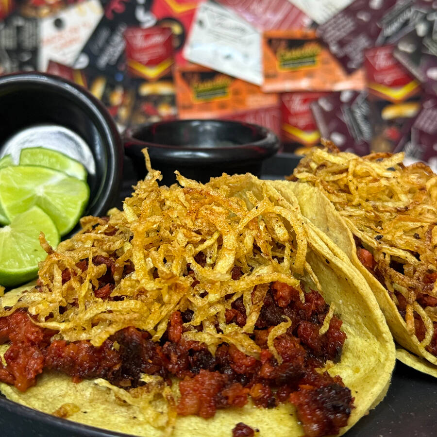 DOBLE TORTILLA, QUESO OAXACA, CEBOLLA CARAMELIZADA, CARNE AL PASTOR , PIÑA, PAJA DE PAPA