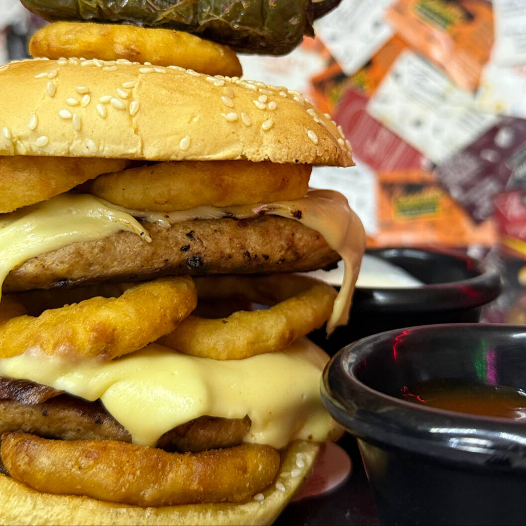 Pan, doble carne, abundante tocino, salsa BBQ o ranch, aros de cebolla y queso manchego.