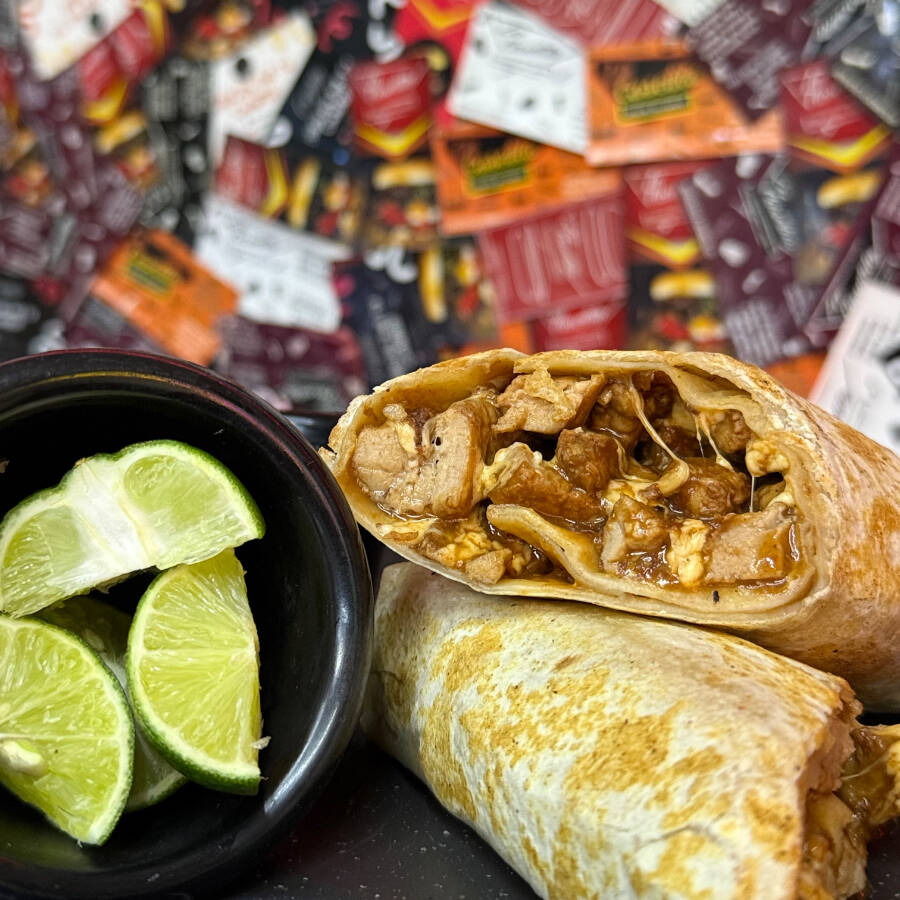es un burro de Tortilla de harina, frijol refrito, queso Oaxaca, salsa de chipotle aparte y 220 de gramos de costilla de res.
