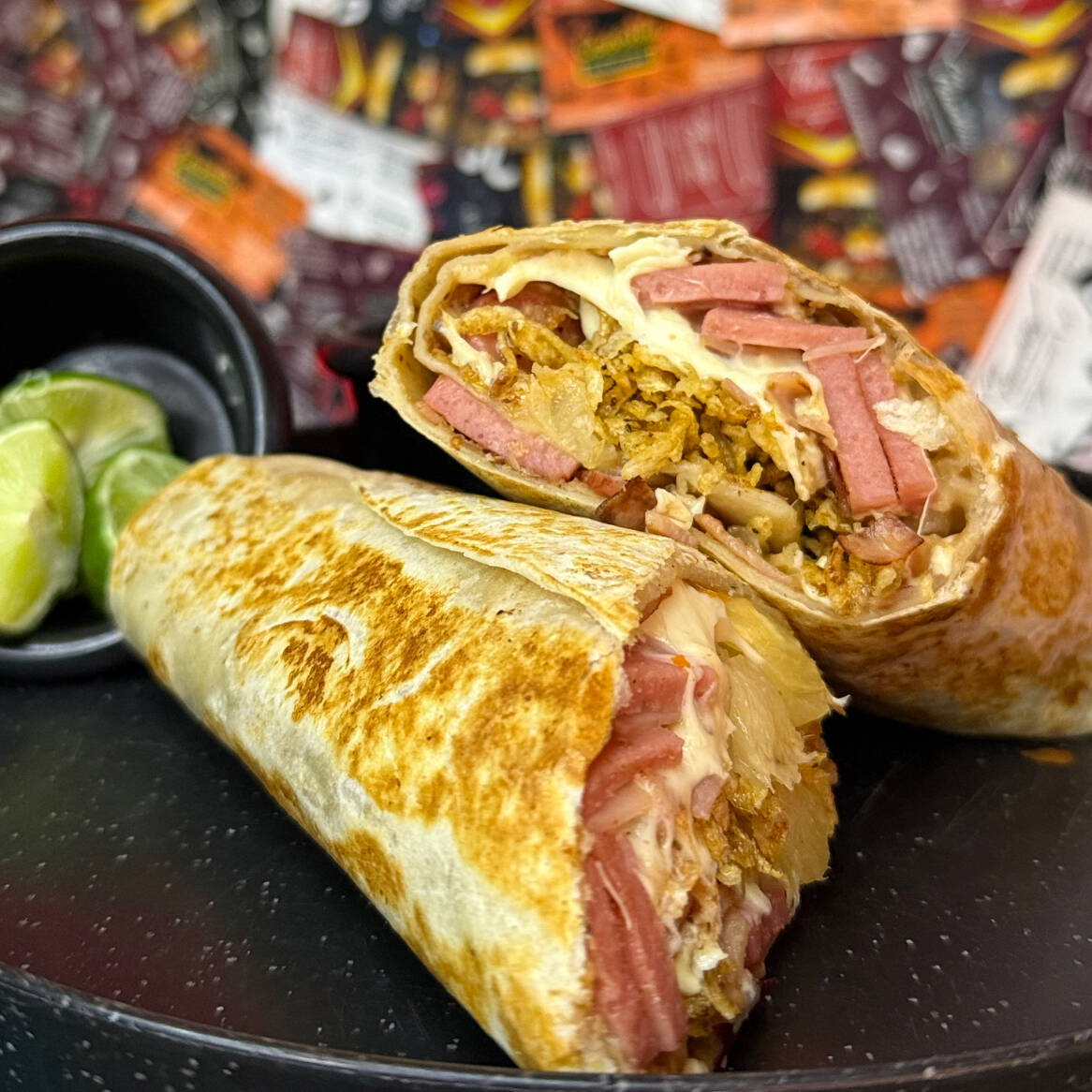 Tortilla de harina, frijol refrito, queso Oaxaca, salsa de chipotle aparte, jamón, salchicha, tocino y piña.