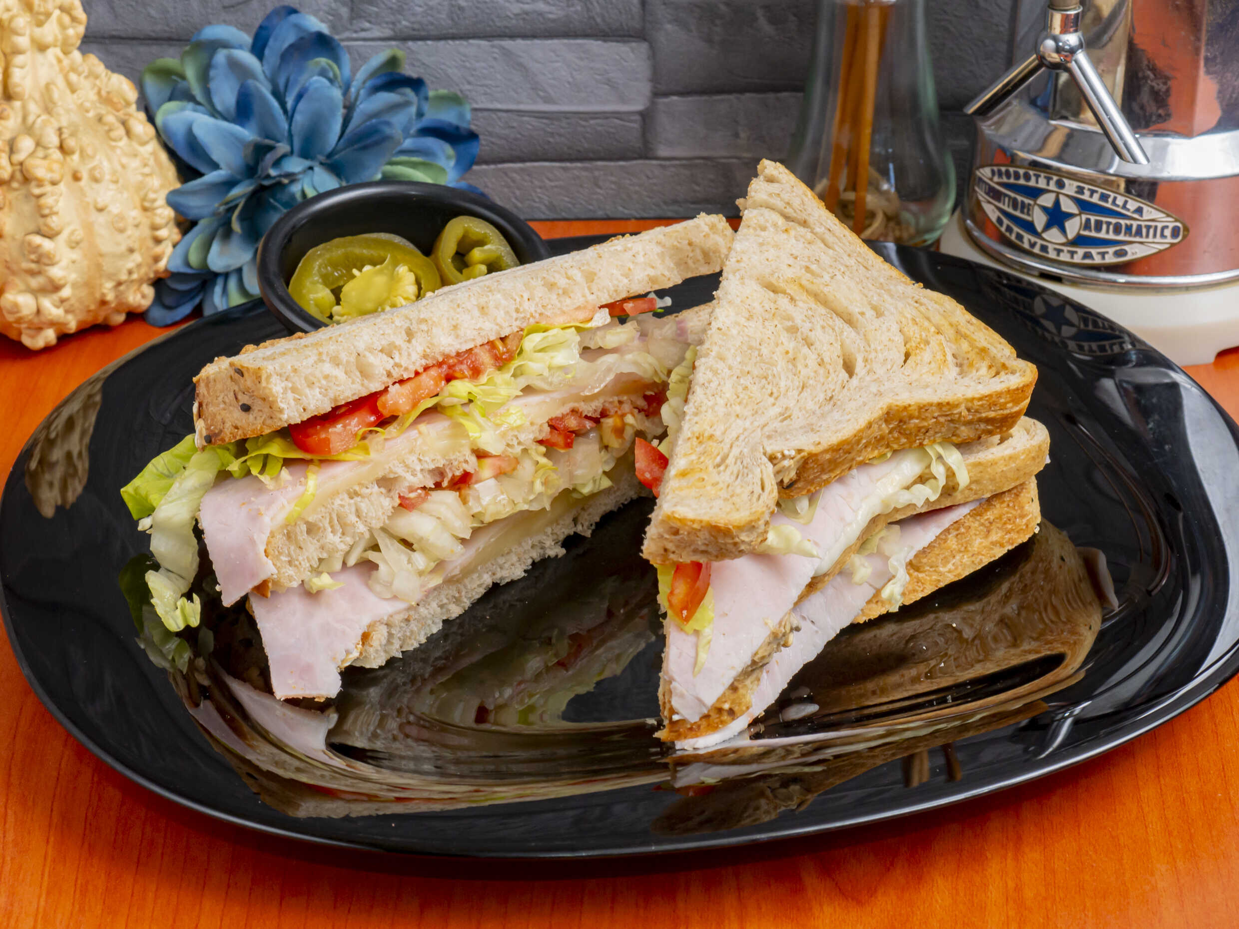 Emparedado hecho con tres rebanadas de pan con jamón, queso y vegetales.