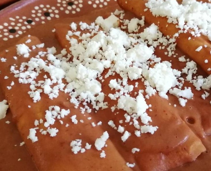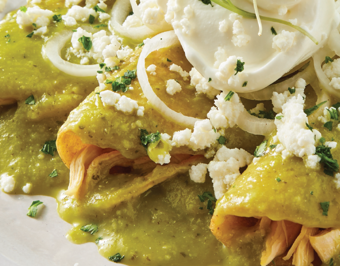 Enchiladas verdes ó rojas gratinadas con queso. Incluye jugo ó fruta y café o té.