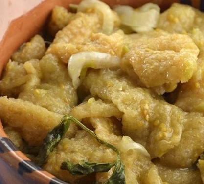 Chicharrón cocinado en salsa suave, sazonado con cilantro, acompañado de frijoles refritos. Incluye jugo ó fruta y café o té.