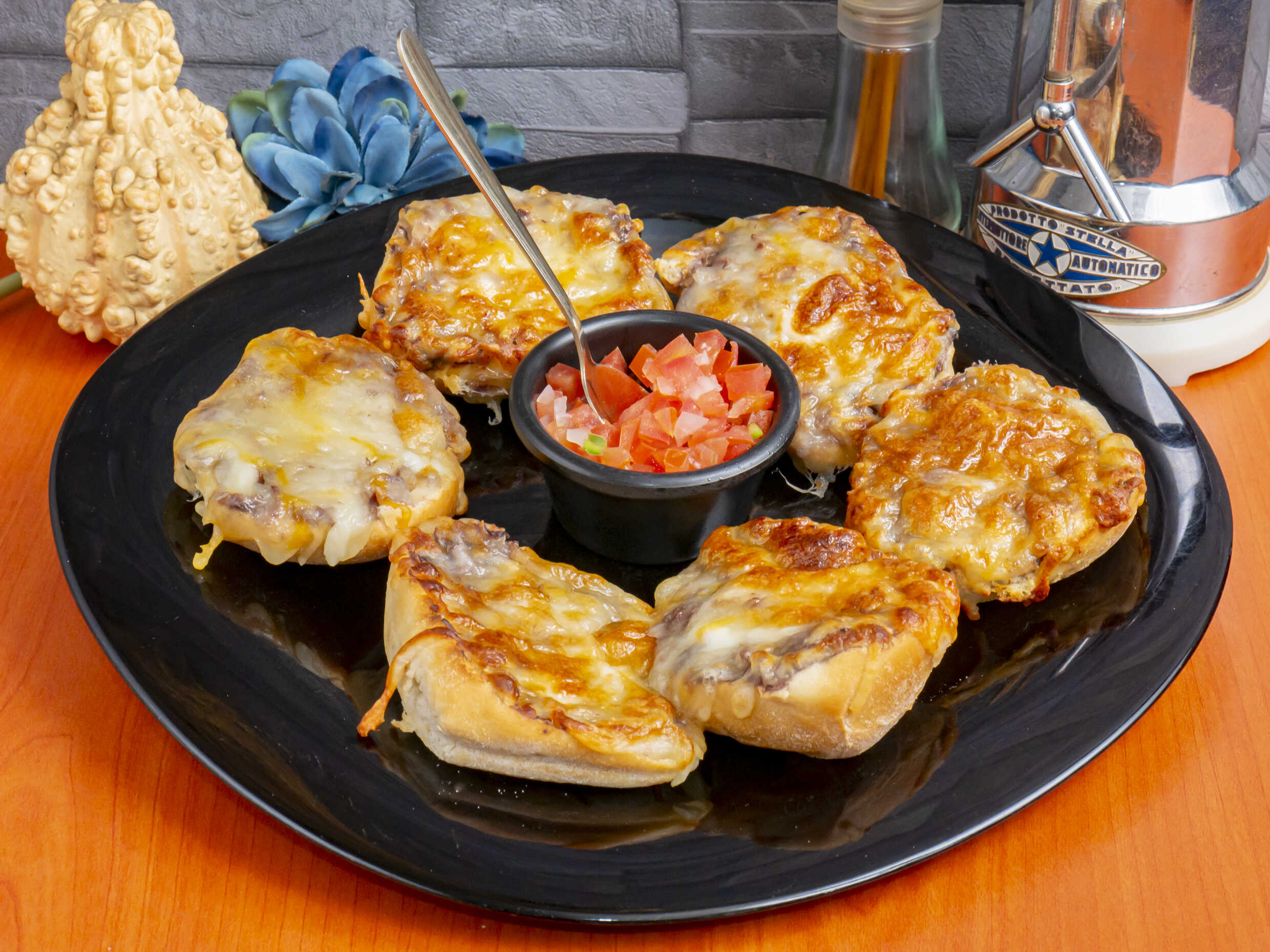 Cremosos frijoles gratinados montados en bollos caliente, acompañados con salsa pico de gallo.