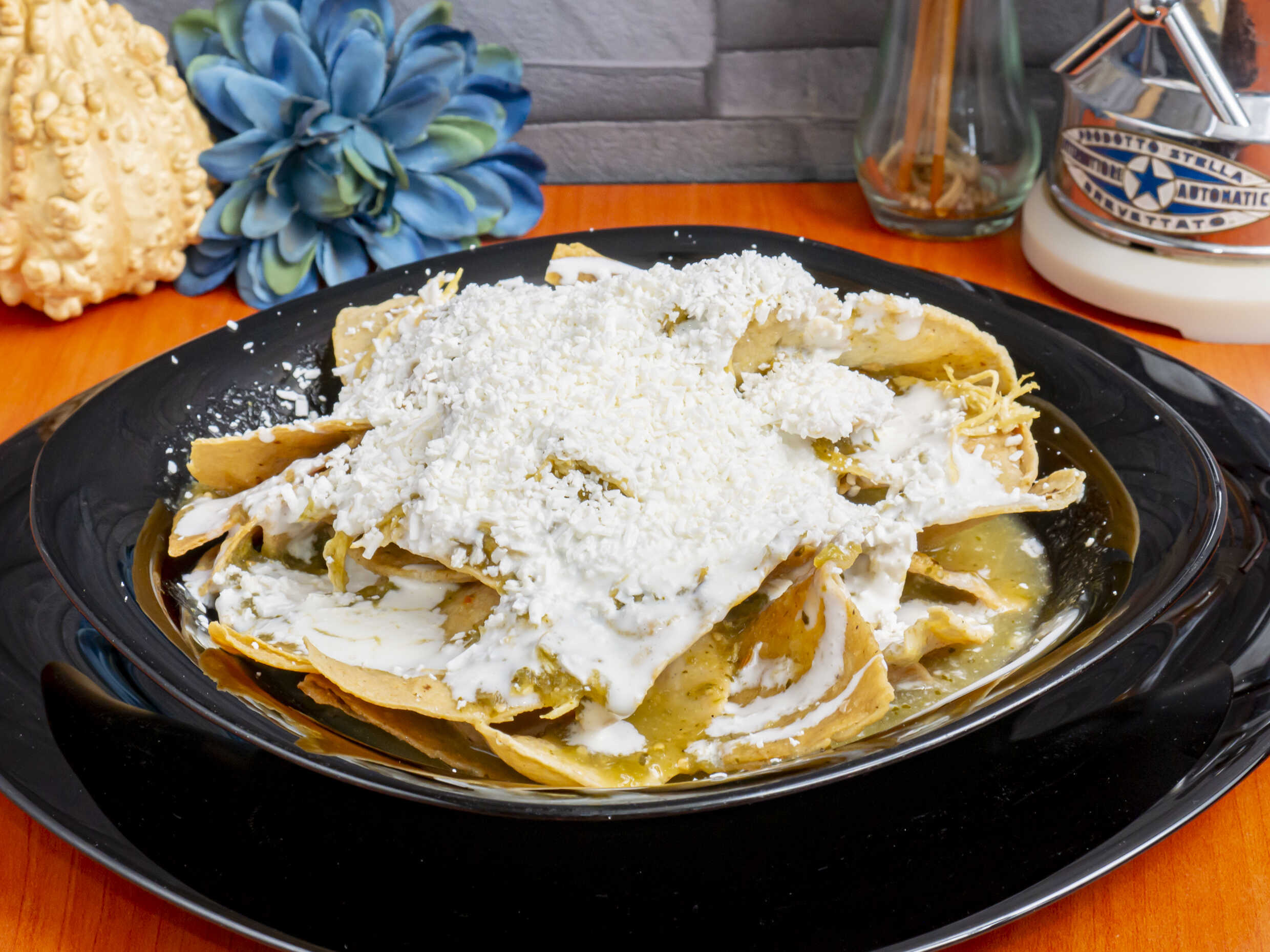 Base de tortilla de maíz dorada, con salsa de frijoles, acompañadas de crema y queso. Incluye jugo ó fruta y café o té.