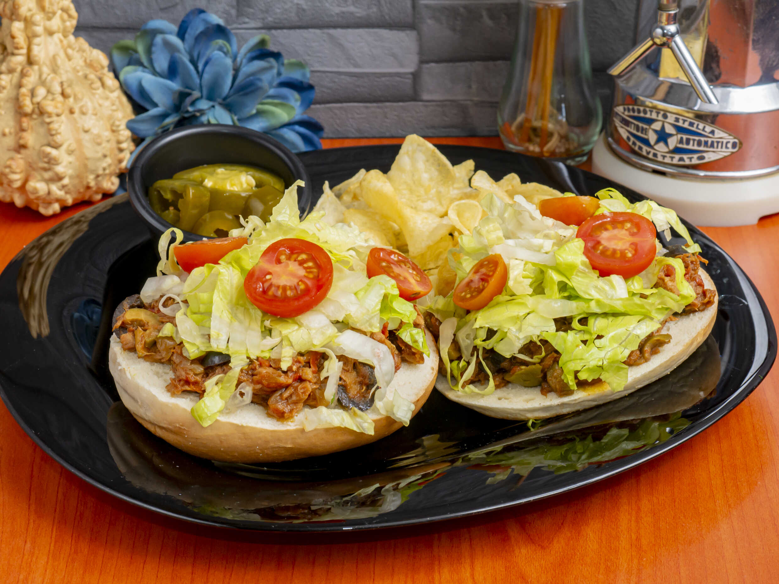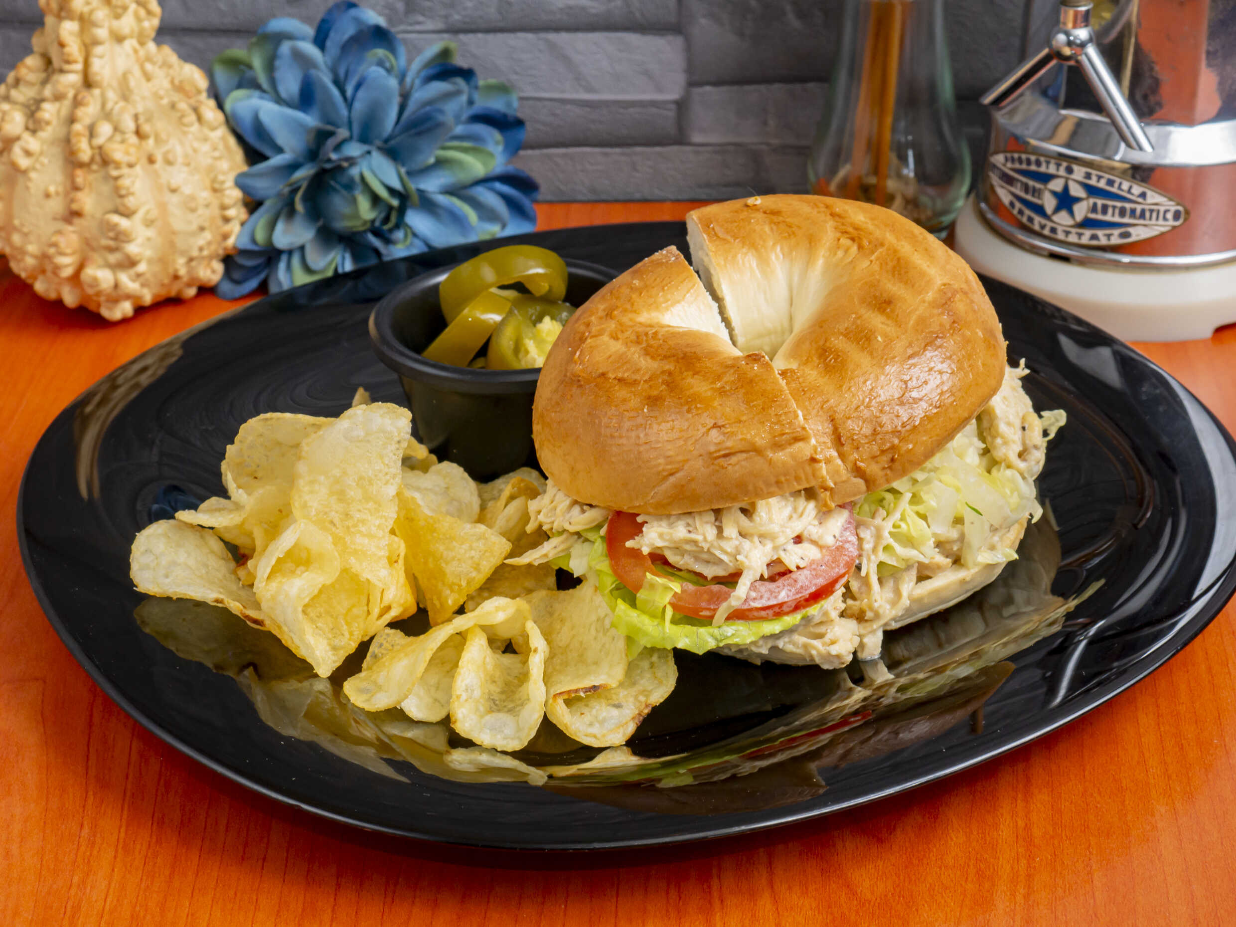 Pan ligeramente tostado relleno de cremosa ensalda de pollo acompañado de papitas crujientes.