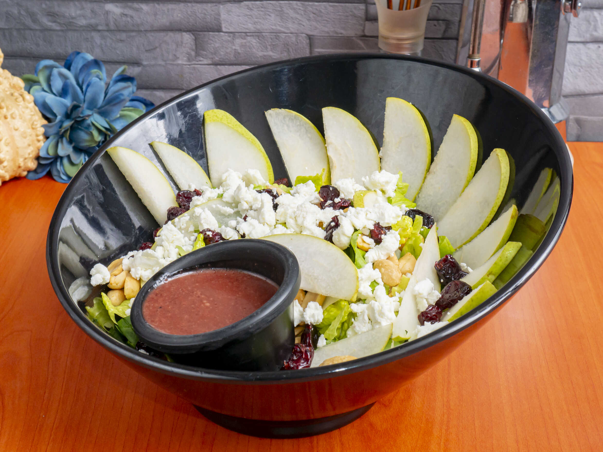 Balanceada combinación de lechuga italiana y espinaca baby con gajos de pera de anjou, cacahuate tostado, queso de cabra, arándanos y vinagreta de frutos rojos