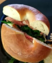 Pan ligeramente tostado relleno de salmón ahumado acompañado de queso crema.