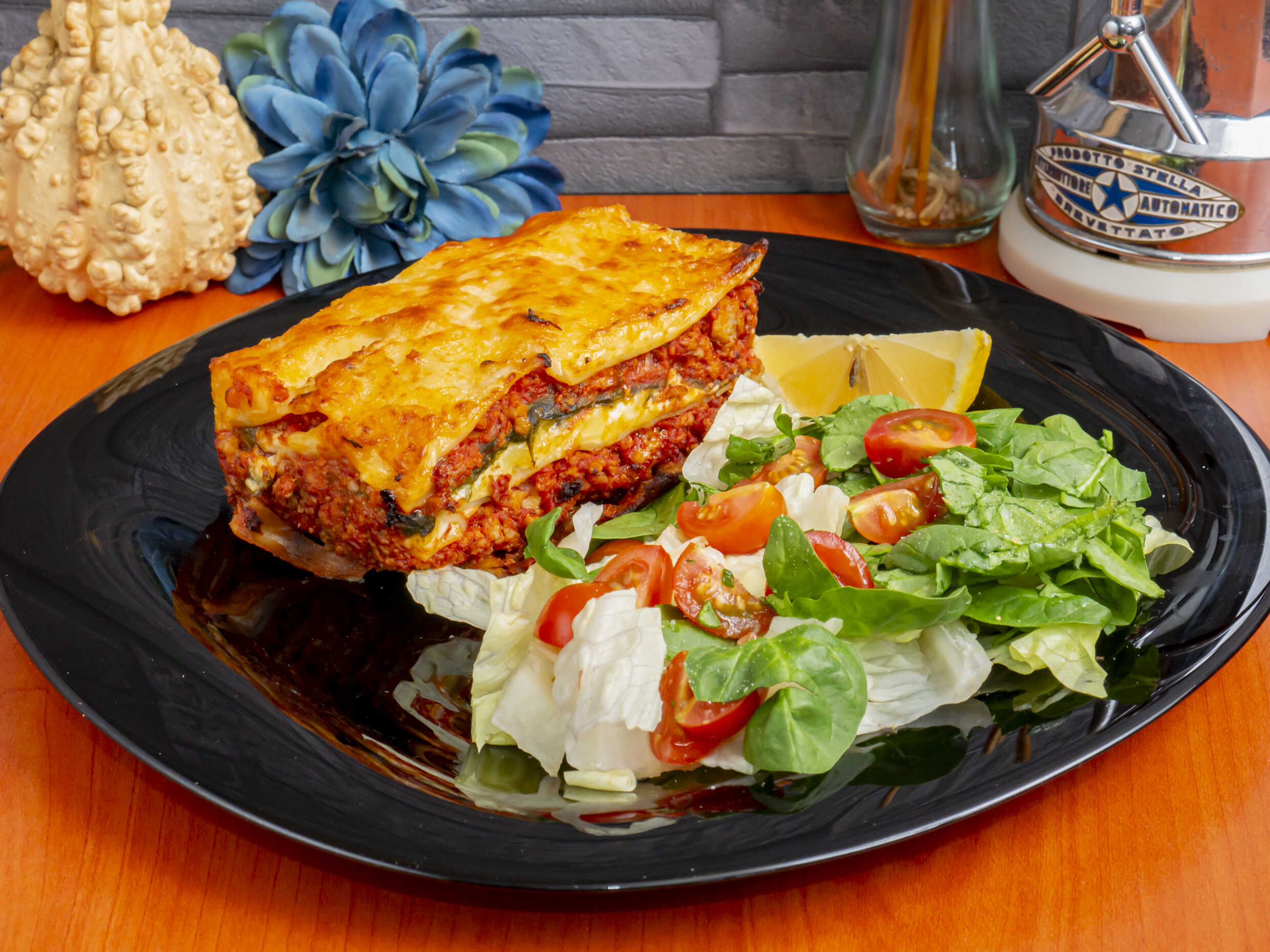 Capas de pasta al dente, alternadas con salsa boloñesa, queso parmesano y queso ricota gratinados.