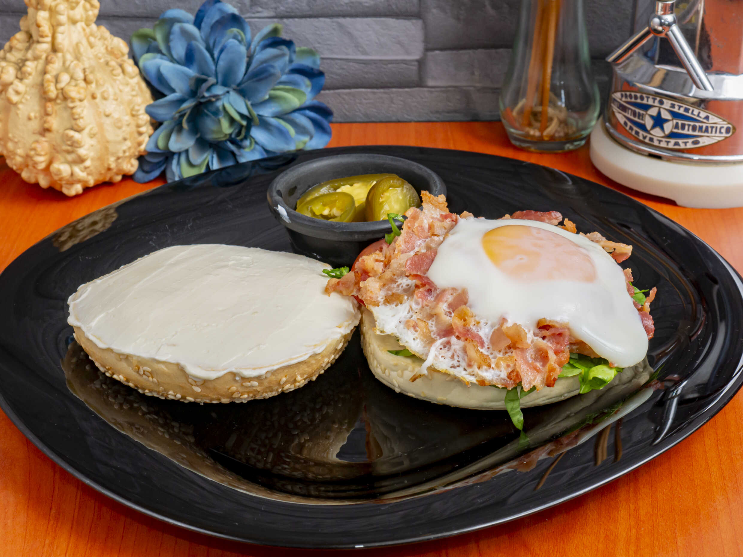 Pan ligeramente tostado con espinaca, tocino, queso, huevo estrellado y aderezo de la casa.
