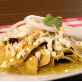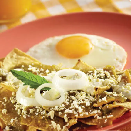 (triángulos de tortilla de maíz fritos) que se bañan en una salsa verde caliente.Se coloca sobre las tortillas. La clara debe estar bien cocida y los bordes ligeramente dorados, mientras que la yema permanece líquida para que, al romperse, se mezcle con la salsa y los totopos.IMAGEN DE REFERENCIA