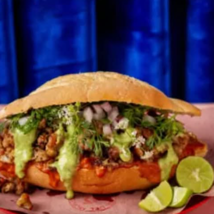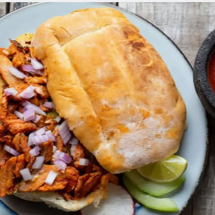 Crujiente pan de sal tamaño regular, con carne al pastor y sus complementos.LA IMAGEN ES SOLO UNA REFERENCIA DEL PRODUCTO QUE SE PREPARA