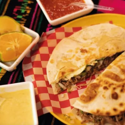 tortilla de harina rellena de queso derretido y carne al pastor, Se hacen en un comal o parilla hasta que el queso se derrite y se sirve caliente.LA IMAGEN ES SOLO DE REFEENCIA PARA TENER UNA IDEA DE LO QUE SE COMPRA