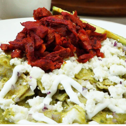 Totopos de tortilla de maíz frita, crujientes y bañados en salsa,Elaborada tradicionalmente con tomatillo verde, chiles (serrano o jalapeño),Carne de cerdo marinada en un adobo de chiles secos (achiote, chile guajillo), especias y, en ocasiones, piña, asada originalmente al estilo "trompo".LA IMAGEN ES SOLO DE REFERENCIA