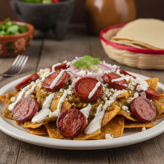 totopos (triángulos de tortilla de maíz frita o dorada) que sirven como soporte para los demás ingredientes ,A diferencia de las versiones clásicas con pollo o huevo, esta variante incluye salchichas de pavo o cerdo cortadas en rodajas y previamente fritas hasta que estén doradas, lo que añade un contraste salado y ahumado LA IMAGEN ES SOLO DE REFERENCIA