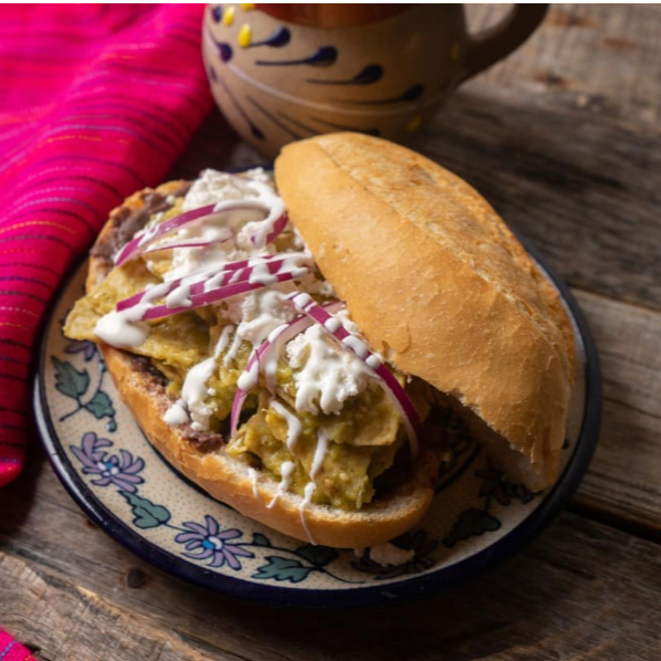 Torta de Chilaquiles que contiene:totopos bañados en salsa Verde ,queso fresco,cebolla picada , crema y puedes seleccionar una proteina a Tu gusto.La Imagen es de Referencia
