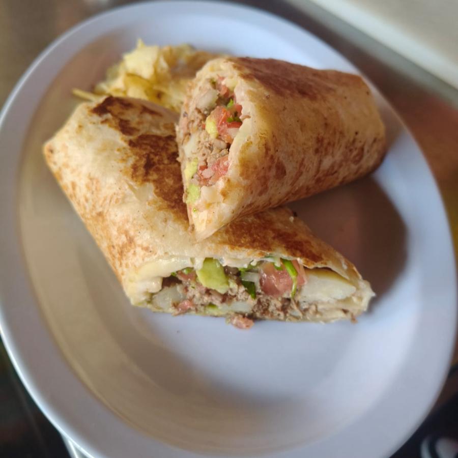 Tortilla de harina, frijol, queso, toque de mayonesa.