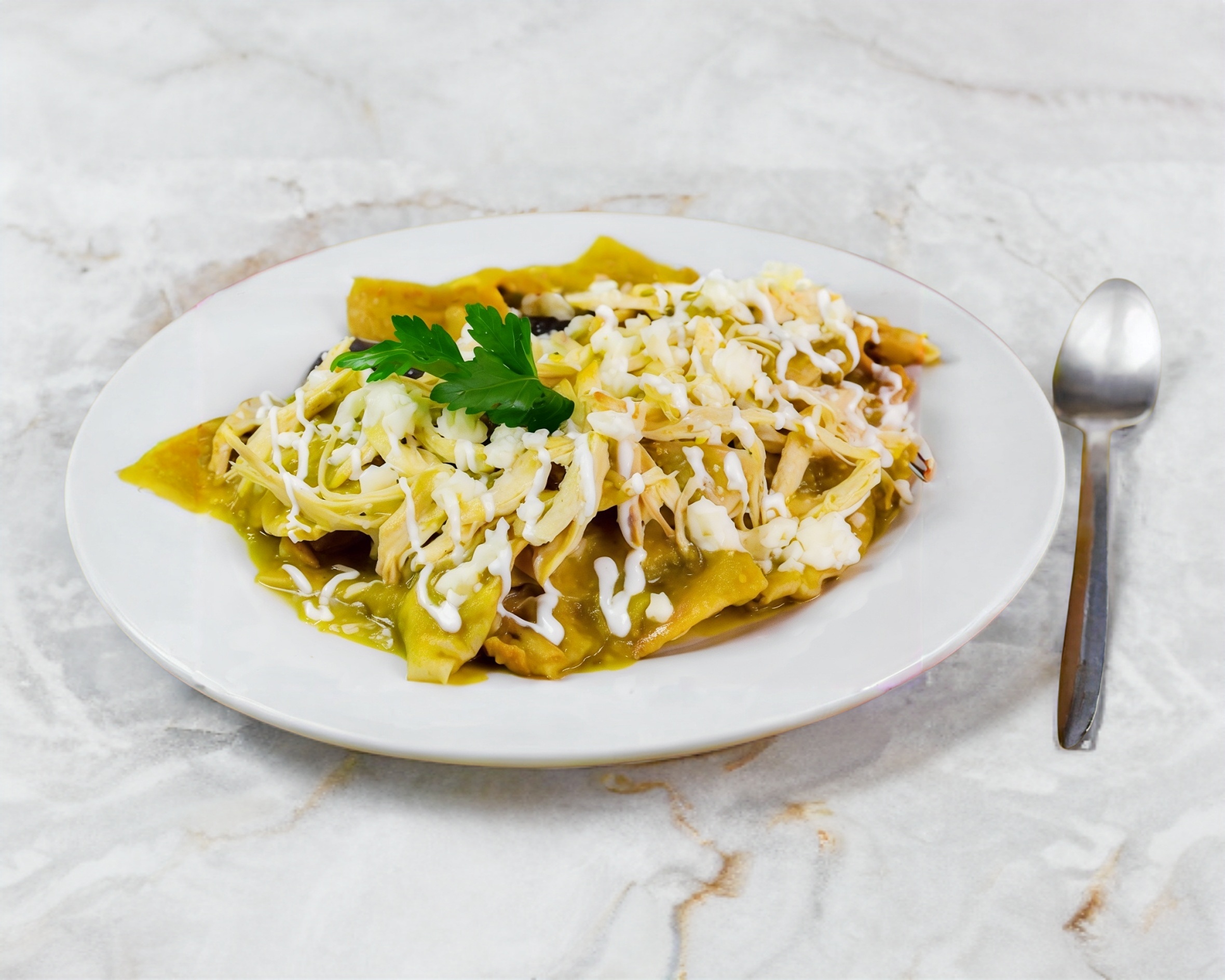 Salsa verde, crema, queso, cebolla