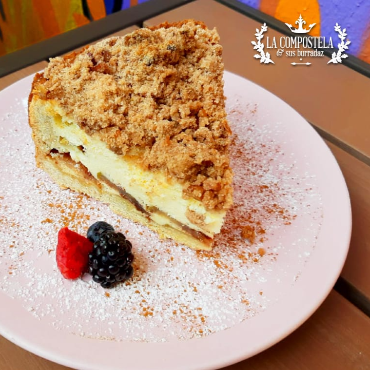 Exquisita tarta rellena con manzana y cheesecake. En su superficie una costra de nuez y canela