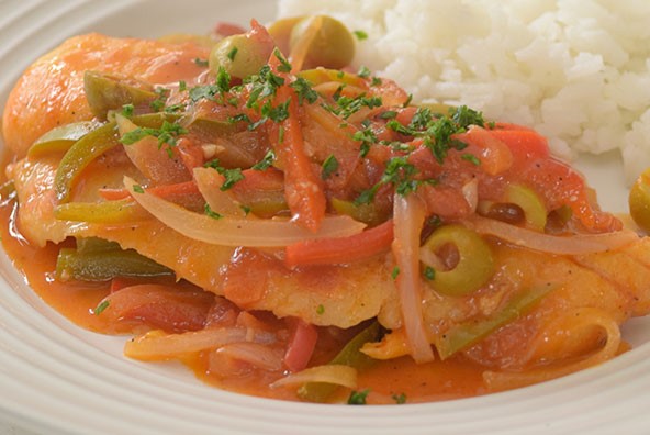 Delicioso filete a la veracruzana con aceitunas, alcaparras y hierbas de olor.