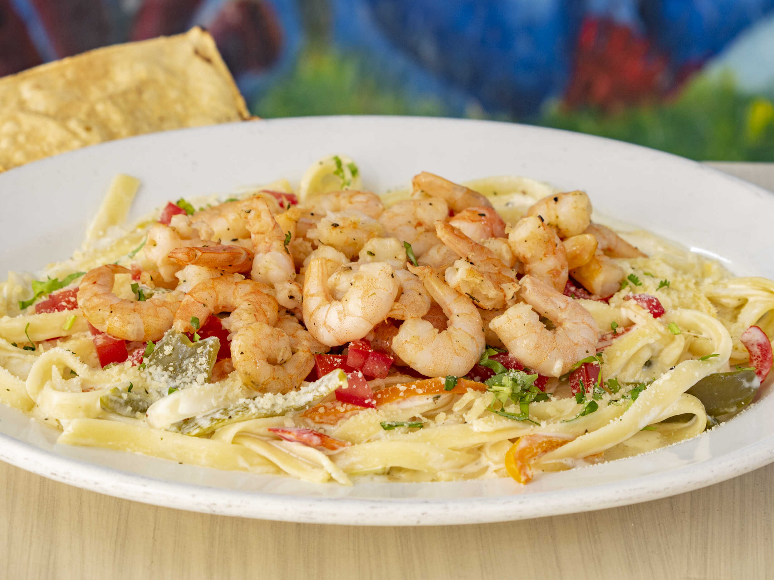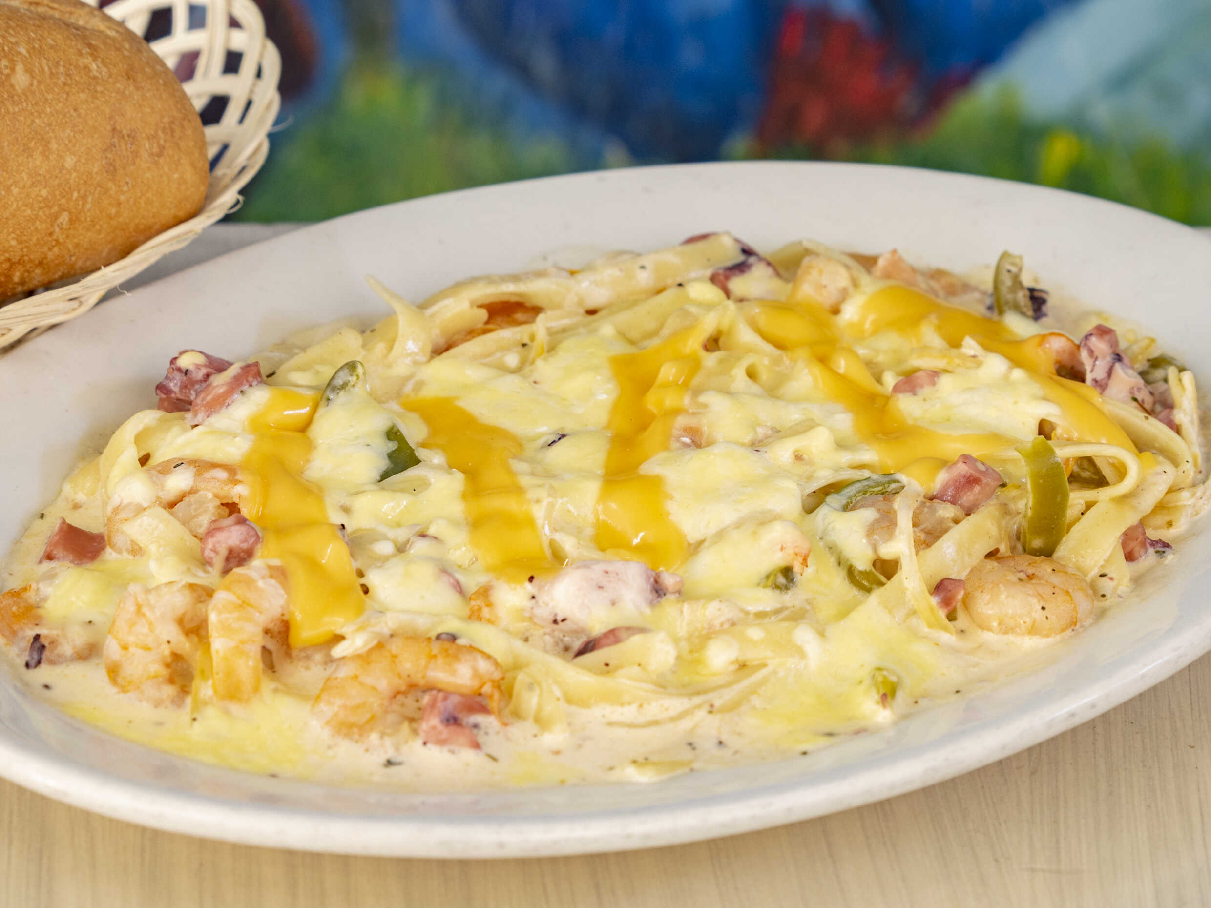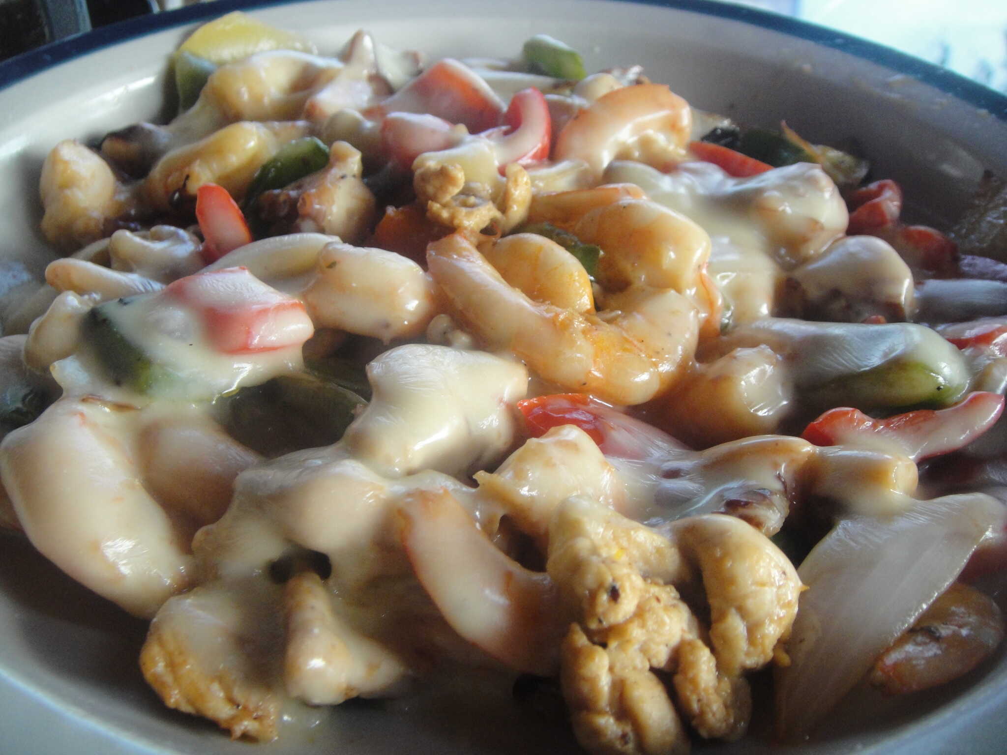Pasta en salsa blanca con camarón, pulpo, pimiento morrón, cebolla, y tres quesos.