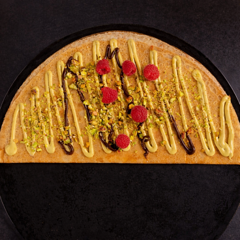 Crema de pistache con Nutella o chocolate semiamargo, pistache tostado y frambuesa fresca.