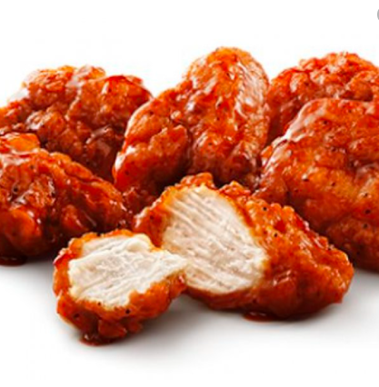 Trocitos de pechuga de pollo empanizados con salsa de tu preferencia.