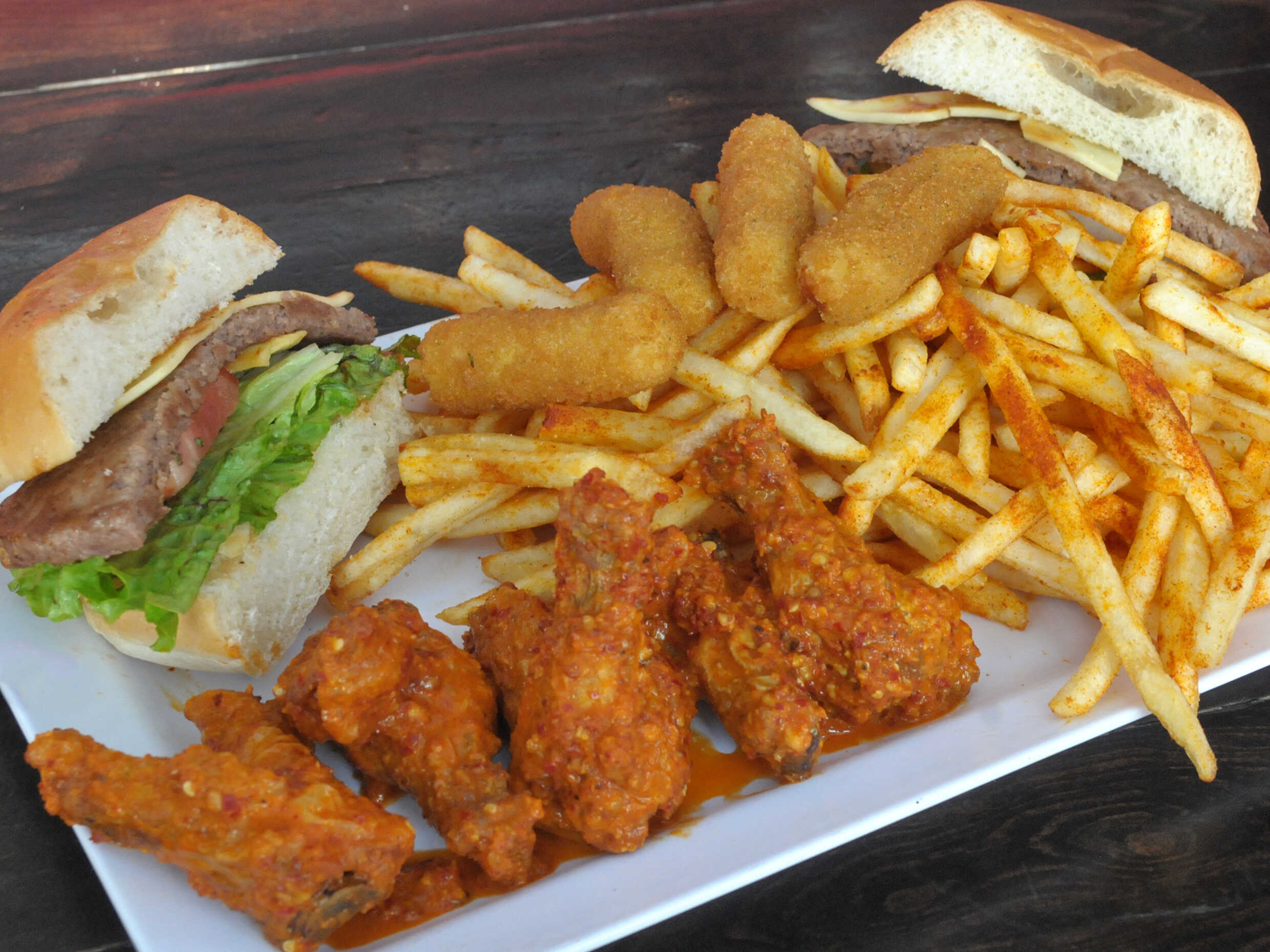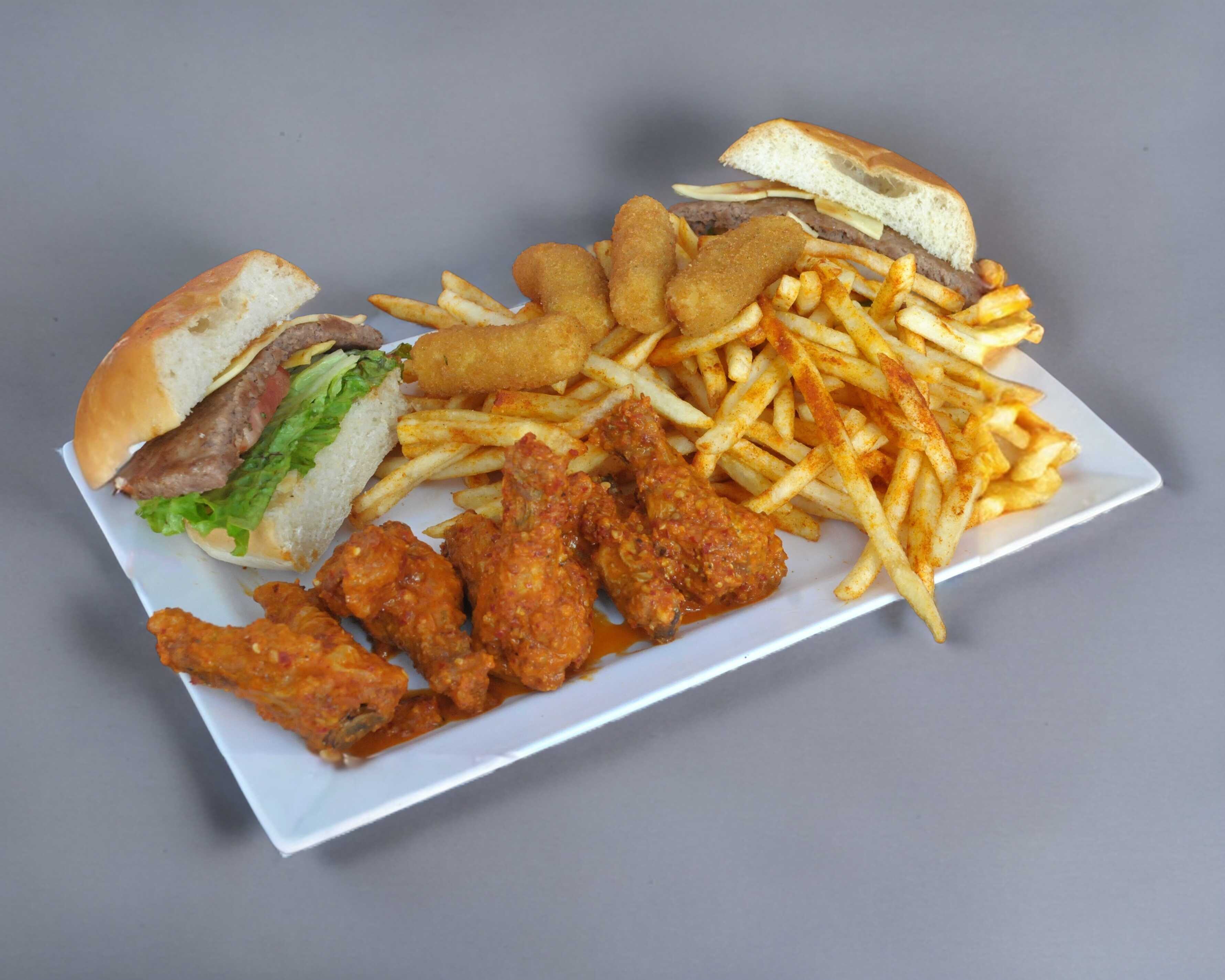 Un combo irresistible!!! incluye; 10 alitas, una orden de aros de cebolla, una orden de jalapeños rellenos, una orden de papas a la francesa, 1 orden de dedos de queso y dos hamburguesas de 110 grs cada una.