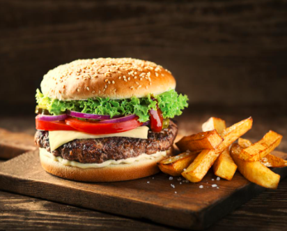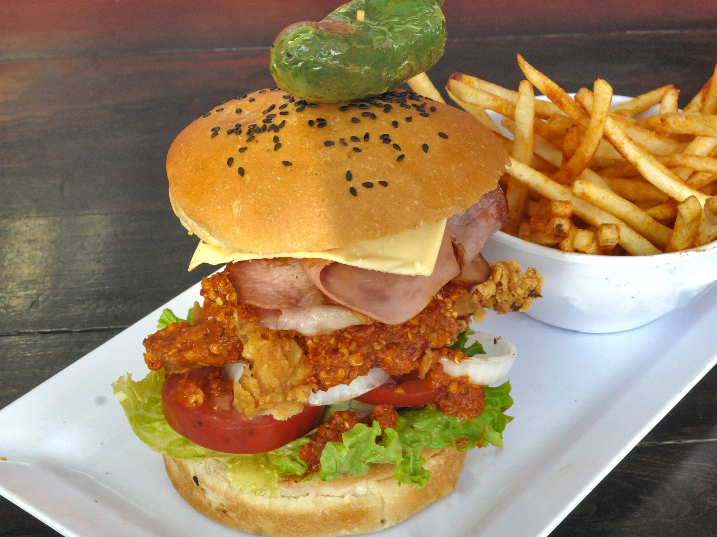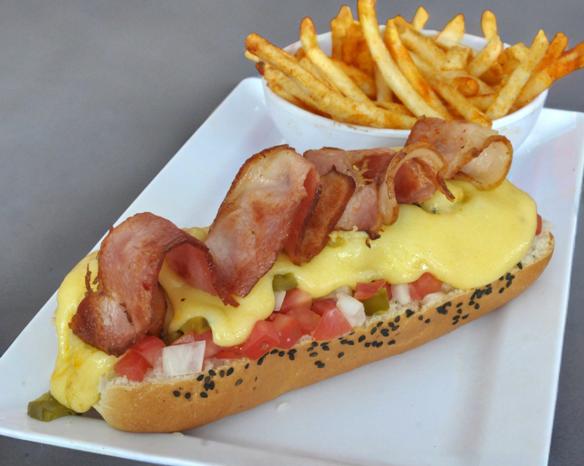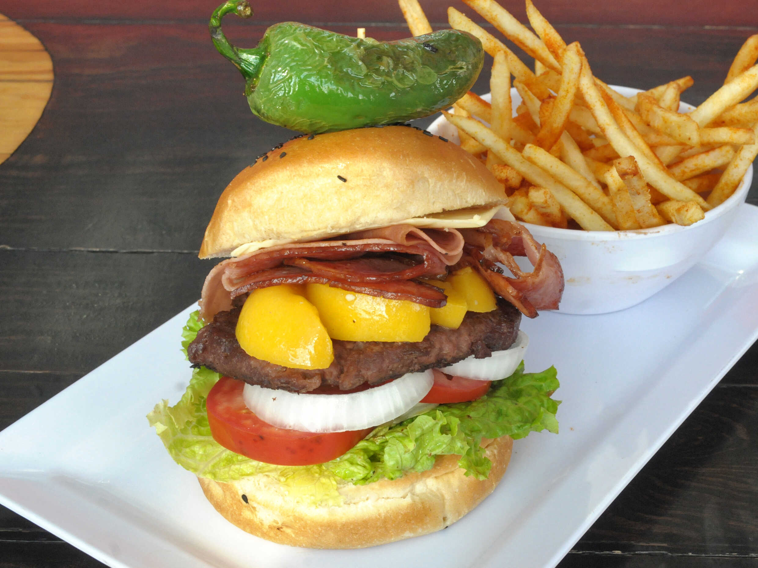 100% de res con queso, jamón, durazno y tocino. Acompañada de papas a la francesa.
