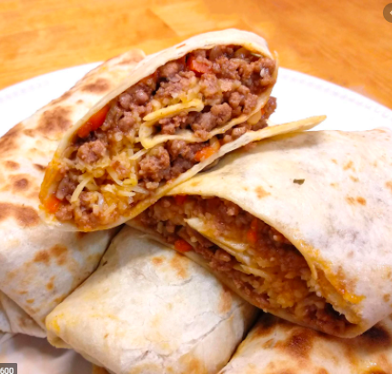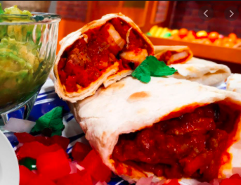 Tortilla burrera con frijoles, deliciosa pechuga cryspi bañada en salsa picante con queso, jamon y tocino.