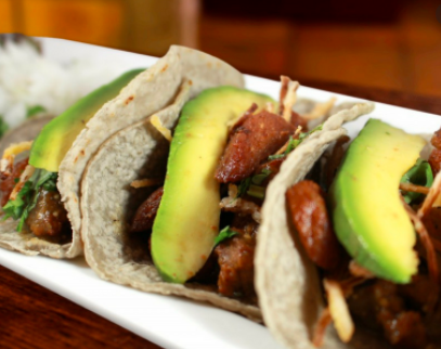 tres deliciosos tacos de jugosa arrachera servidos con tortilla de harina, frijoles y costra de queso, acompañados con guacamole y chilitos toreados.