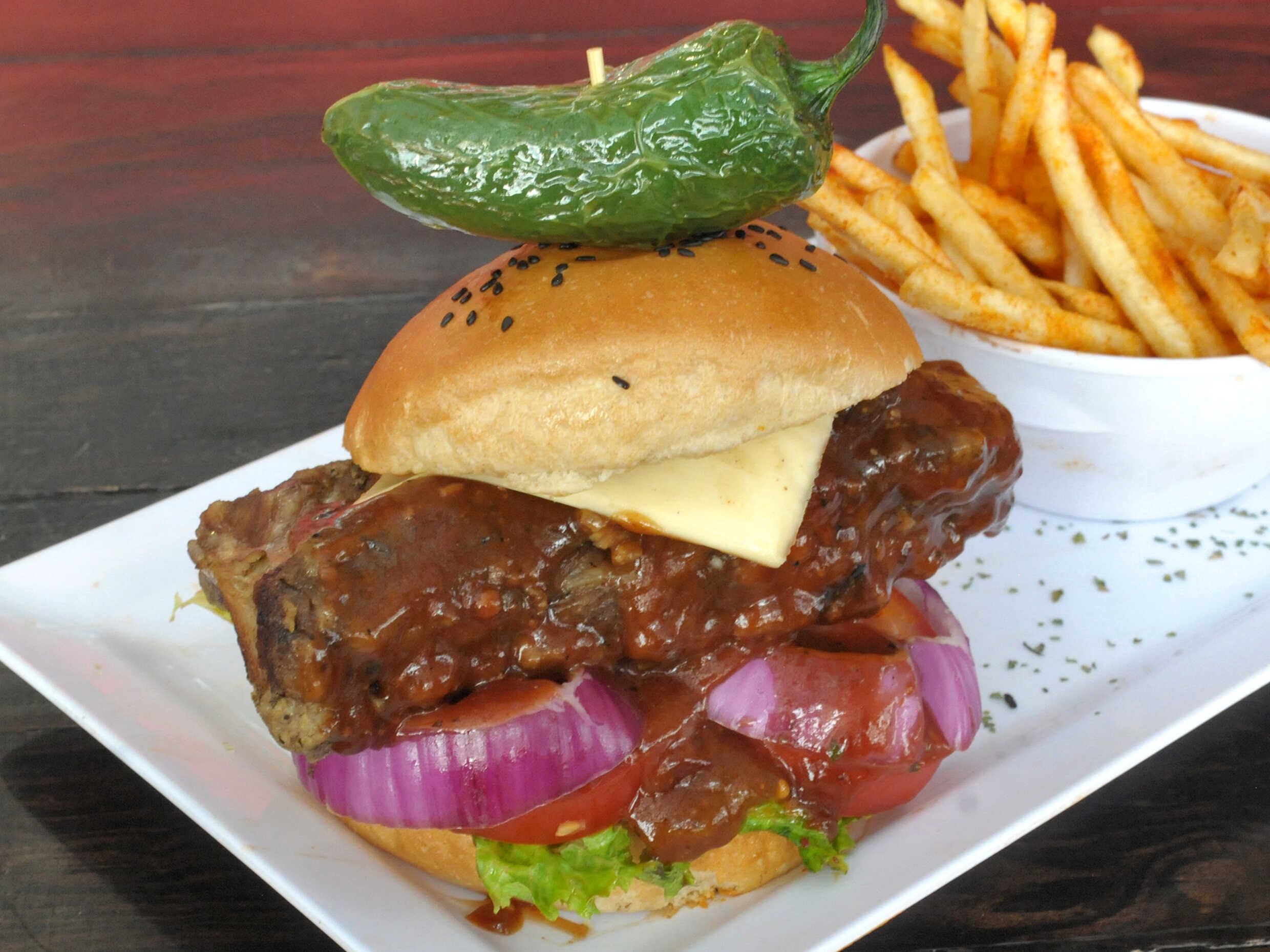 Tortilla burrera con frijoles, acompañado con costilla de cerdo horneada y bañada en salsa bbq, queso, cebolla, pimientos y tocino.