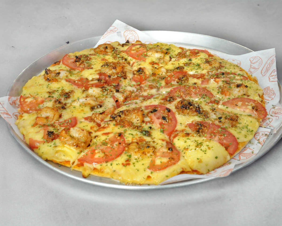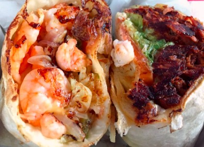 Tortilla burrera con frijoles, camaron, jitomate, pimiento, cebolla y queso.