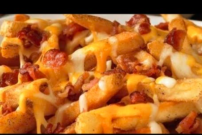 Papas a la francesa con tocino y bañadas con queso cheddar.