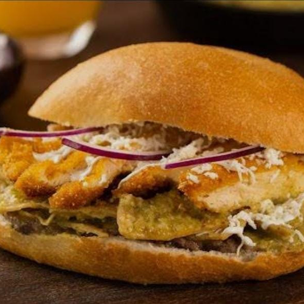 pan ,frijoles ,pechuga empanizada acompañada de lechuga ,mayonesa ,jitomate cebolla ,aguacate rajas o chipotle