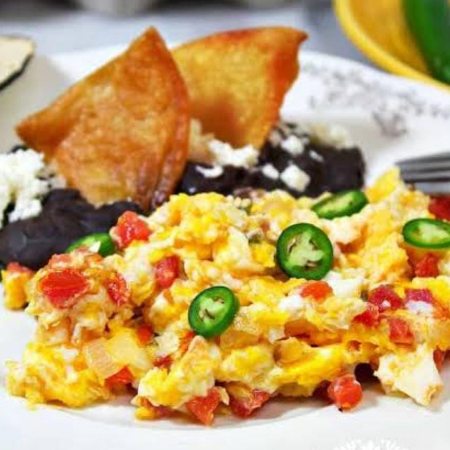 huevo, jitomate,cebolla ,chile verde acompañado de frijoles refritos negros
