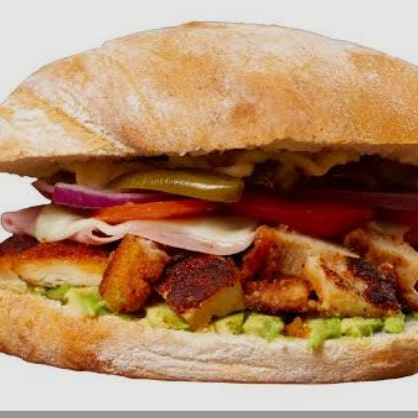 pan,milaneza acompañada de lechuga ,jitomate,cebolla rajas mayonesa y aguacate
